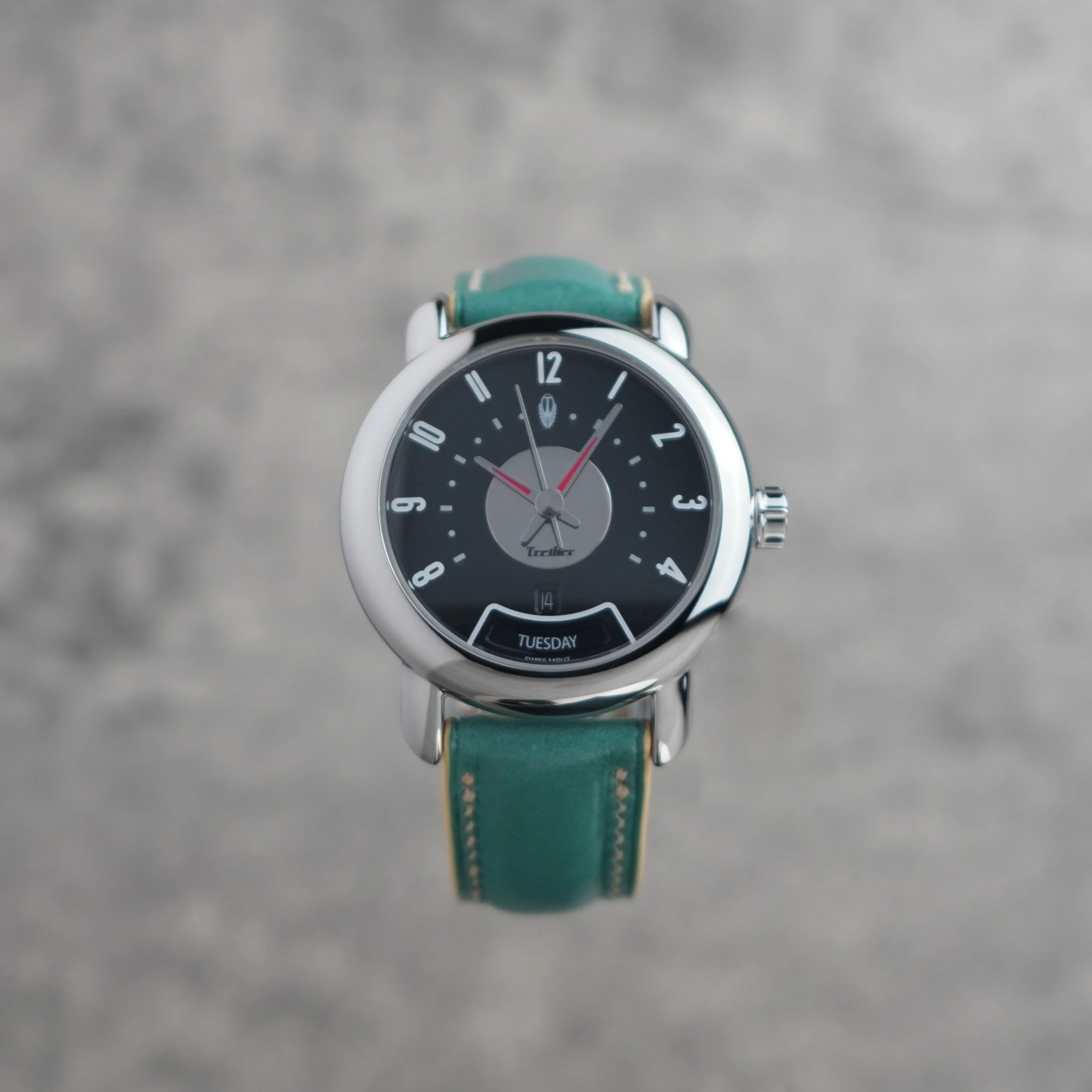 The T57BA features an automatic Swiss movement with day and date indicators. Treiber has modified the Swiss made STP 4-13 movement to place the day of the week at the 6 o-clock position, giving this watch a unique layout.